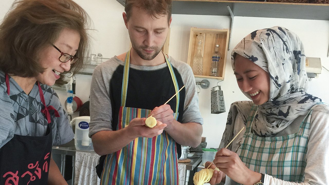 We start our food journey by exploring the local fresh market. You will learn more about Thailand’s food culture, get to know what the local people love to eat and drink. You will also get to see, smell and taste the different herbs, spices, vegetables and fruits used in Thai cooking. While walking through the market you will have the opportunity to drink some refreshing coconut juice or have some sweet sugarcane juice. After the market we will head home, where you will get some hands-on experience with Thai cooking. Supawan and Boonhome will guide you while you learn to cook some unique Thai foods.